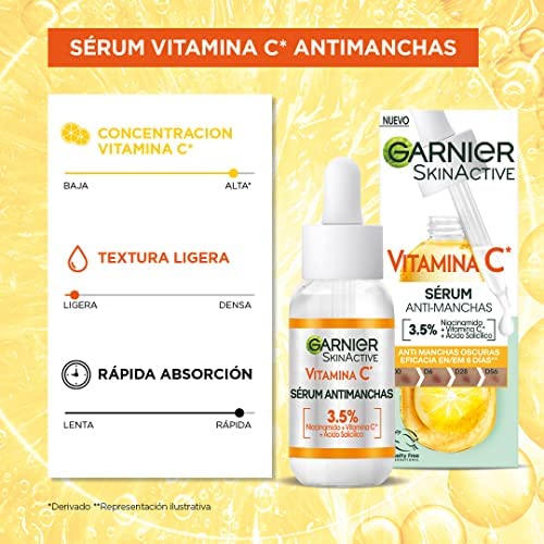 Sérum Garnier con Vitamina C, Niacinamida y Ácido Salicílico reduce manchas en 6 días. Aprobado por laboratorios, vegano y Cruelty Free.