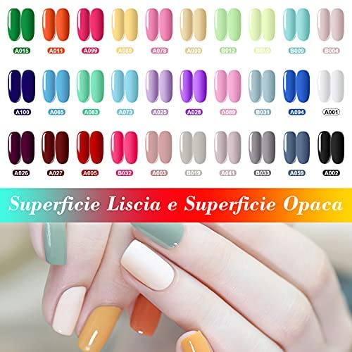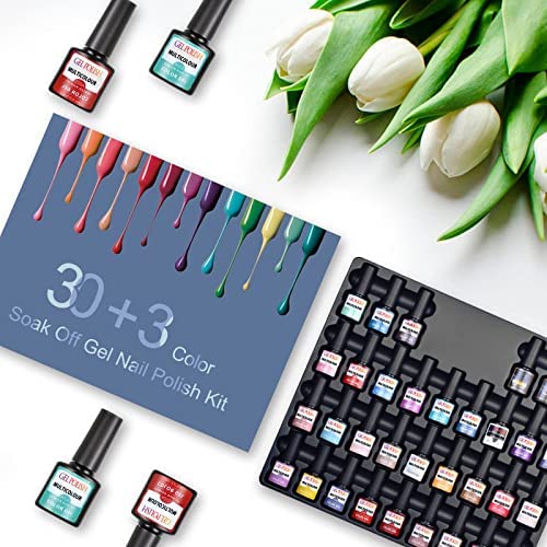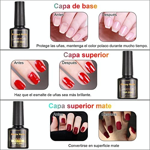 Set de 33 esmaltes semipermanentes de 8ML SHOWNAIL en 30 colores con base, top coat brillante y mate, incluye blanco, negro, azul y pastel.