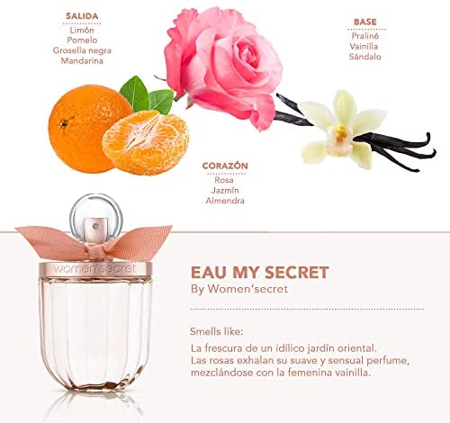 «Eau My Secret» es una fragancia oriental y floral de Women’secret. Con notas de limón, pomelo, rosa, jazmín, praliné, almizcle y vainilla que crean una fragancia sofisticada y delicada. Perfecta para mujeres femeninas y misteriosas. Disponible en 100ml. Descatalogado.