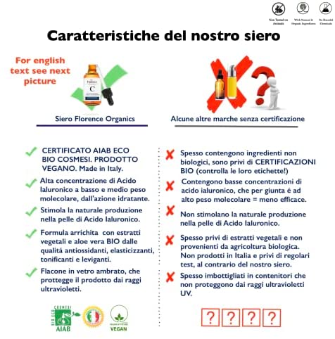 El Serum con Vitamina C de Florence Organics es un suero antiedad orgánico y vegano que hidrata y nutre la piel, reduce arrugas y líneas finas, y disminuye manchas oscuras y daño solar. Está formulado con ácido hialurónico y otros ingredientes antiedad y ha sido testado dermatológicamente. Cuenta con certificación orgánica AIAB Eco COSMÉTICO y garantía de reembolso completo si no se ama el producto en un plazo de 30 días.