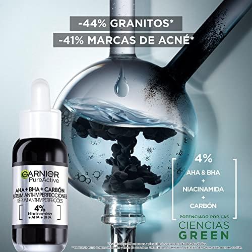 Descubre el sérum con niacinamida y ácido salicílico Garnier Pure Active para decir adiós a las imperfecciones en la piel. Con resultados clínicos en 43 personas, reduciendo el acné y puntos negros en un 35%, aplicando dos veces al día durante 28 días. Fórmula vegana de 30 ml.