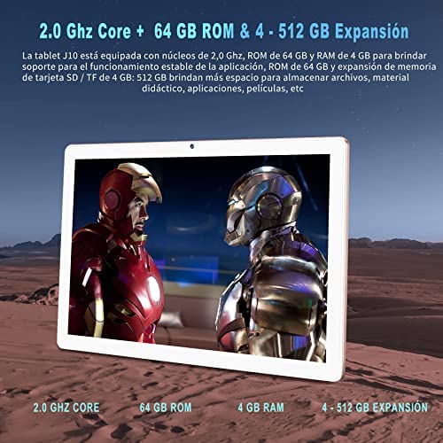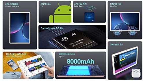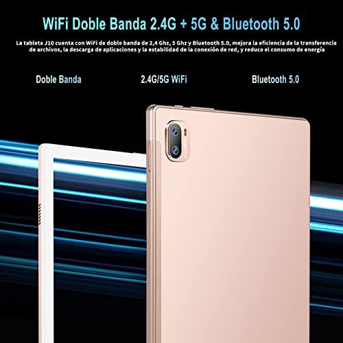 La Tablet J10 de JUSYEA cuenta con un sistema operativo Android 11, procesador de 2.0 GHz, 4GB de RAM, 64GB de almacenamiento expandible y pantalla táctil 2.5D de 10.1 pulgadas. También incluye doble banda WiFi, Bluetooth 5.0, cámaras duales y una batería de 8000 mAh. Además, viene con un paquete que incluye teclado, ratón, lápiz táctil, protector de pantalla y más, para convertirla en una tablet PC 2 en 1.