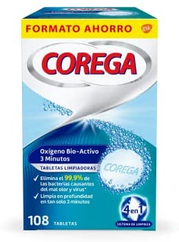 Corega Oxígeno Bioactivo son tabletas limpiadoras para prótesis dentales que eliminan el 99,99% de las bacterias causantes del mal olor en solo 3 minutos y ayudan a eliminar manchas persistentes dejando la prótesis más limpia y fresca. Su fórmula no abrasiva limpia en profundidad sin rayar la prótesis.