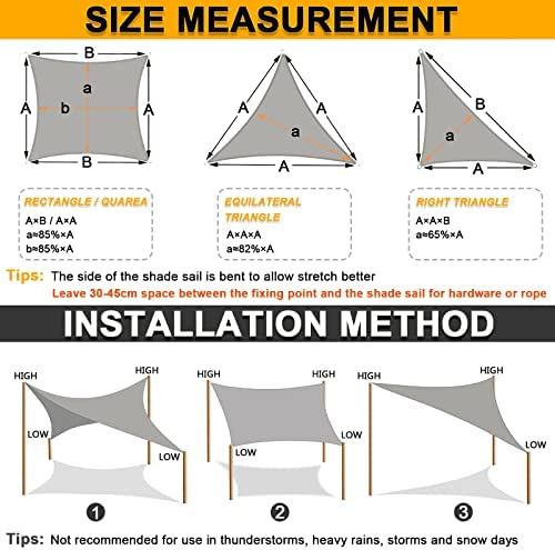 La instalación del Toldo Vela es muy sencilla, solo debes dejar un espacio de 30-45 cm entre el punto de fijación y la lona sombra exterior para hardware o cuerda. La costura del sombreador debe apuntar al suelo y se sugiere un ángulo de montaje de 20 a 40 grados para la máxima tensión. Además, permite que el agua se drene rápidamente.