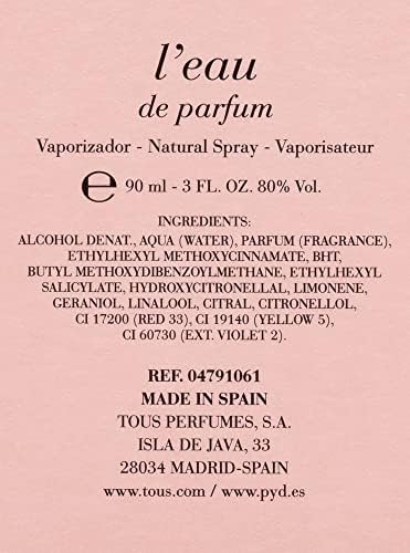 Tous – L’Eau, Eau de Parfum es una fragancia floral amaderada para mujeres que combina notas de mandarina, jazmín, peonía blanca y musk blanco. Es ideal para mujeres románticas y carismáticas. El formato es un vaporizador de 90ml y es fabricado por Tous desde 1920.